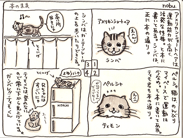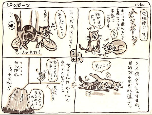 ペルシャ・男の子・2012年 10月20日生まれ。性格はおっとりで人見知り。ねこだけど、おまんじゅうみたいな体格なので運動神経はビミョー。特技は持ち上げると手足をだらり〜んとする(特技と呼べるのか?)呼び名はティモくん。シンバ兄ちゃんが大好きで常に遊びの催促をするが、しばしば度を過ぎてシンバに叱られる。....が、良くわかっていない。高い所にはあまり登れない。だいたいの事はシンバの真似をして覚えた。