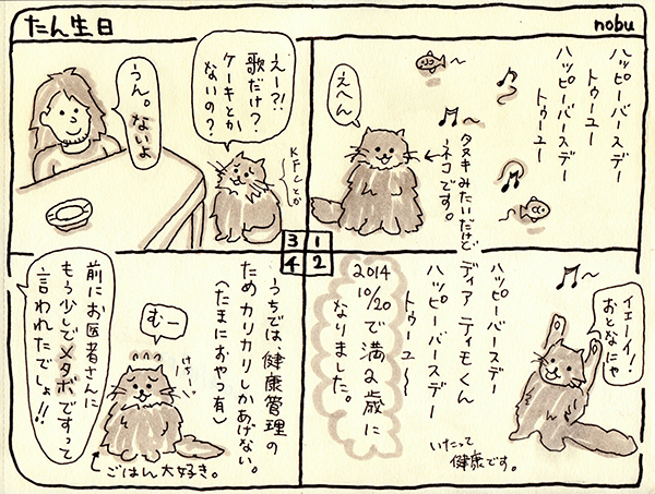 ティモくんが2歳になりました。元気にすくすく育っています。まるくてもふもふなので「タヌキみたいだね」とよく言われますがネコです。これからもよろしくー。