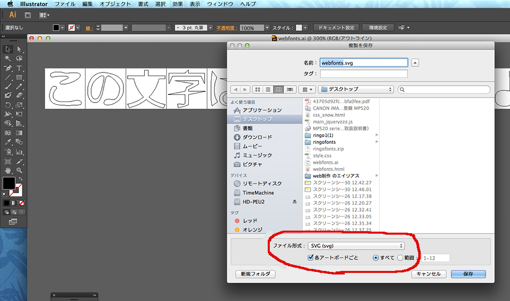 文字の分だけファイルが書き出されました。それを1つのフォルダにまとめておきます。イレストレーターの作業はここまでです。