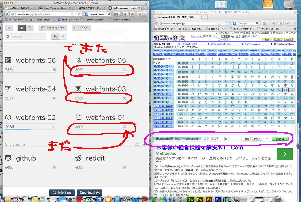そのユニコードをIcoMoonに設定していきます。その文字に設定が出来たら数字の横に「画」と表示されます。まだの所は変な図形みたいなのになってます。