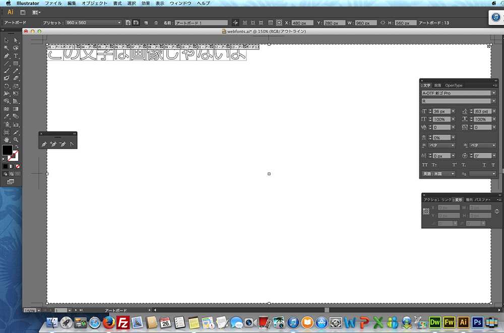 文字の大きさは何ピクセルでも良いです。切りのいい数字が良いです。今回は36pxにしました。文字を選択して、変形パレットで基準点を画面左上にしてX:0 Y:0にします。文字色は黒にして下さい。文字パレットで文字間隔をベタにして下さい。